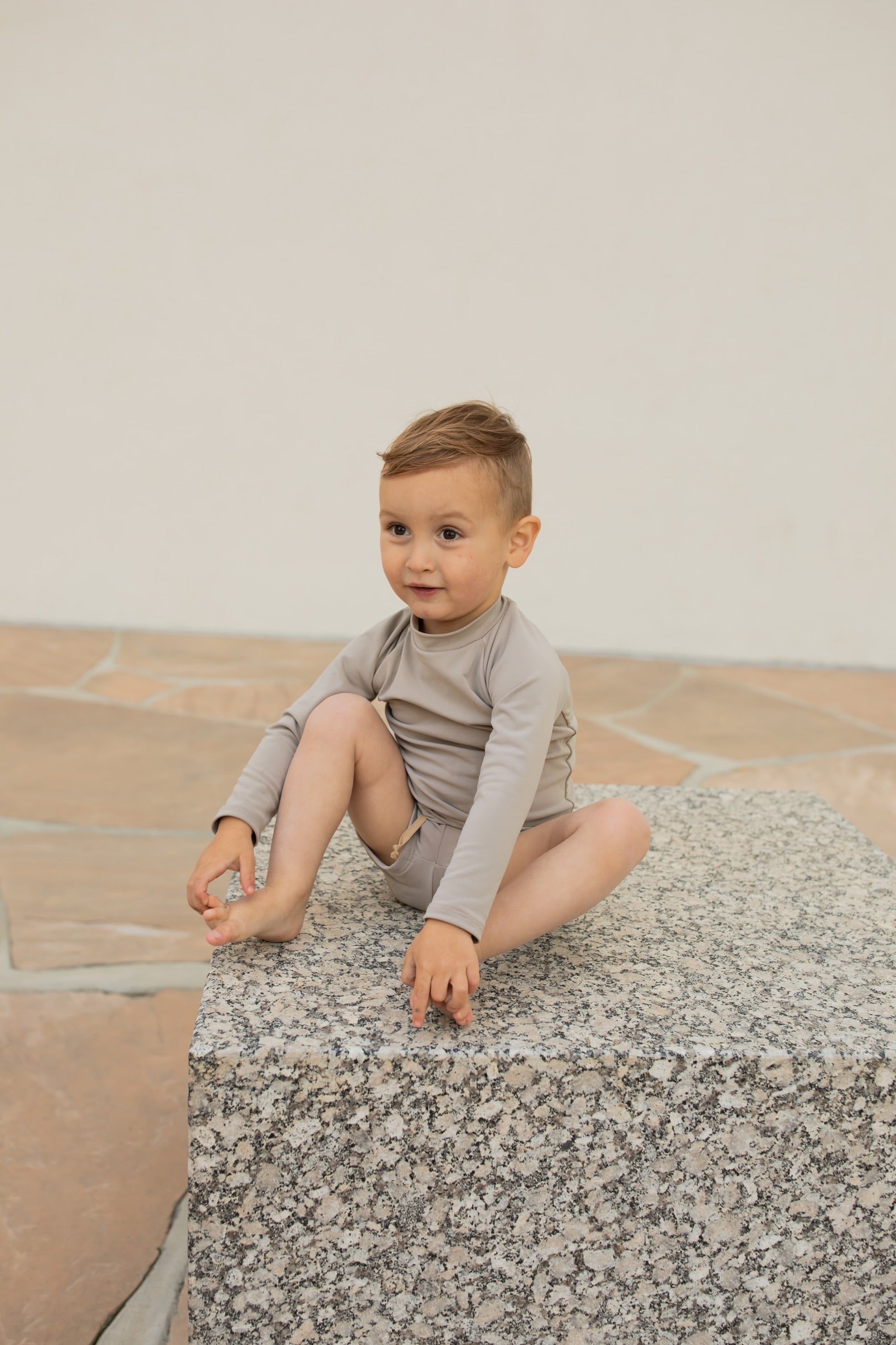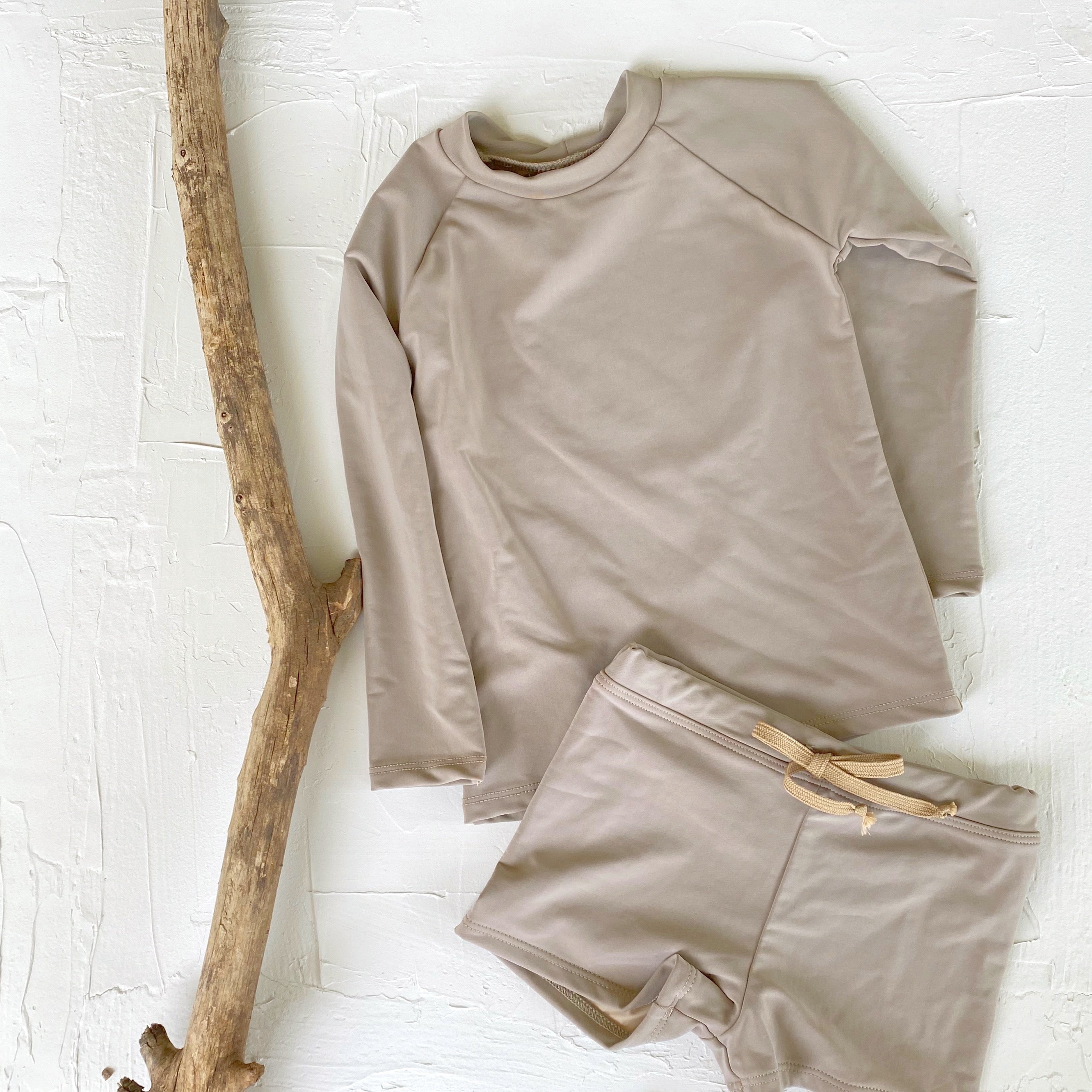 Beachrock is a warm, medium taupe color. It is available in euro shorts, rash guards, girls scoop back one pieces, and the women's snap one piee.