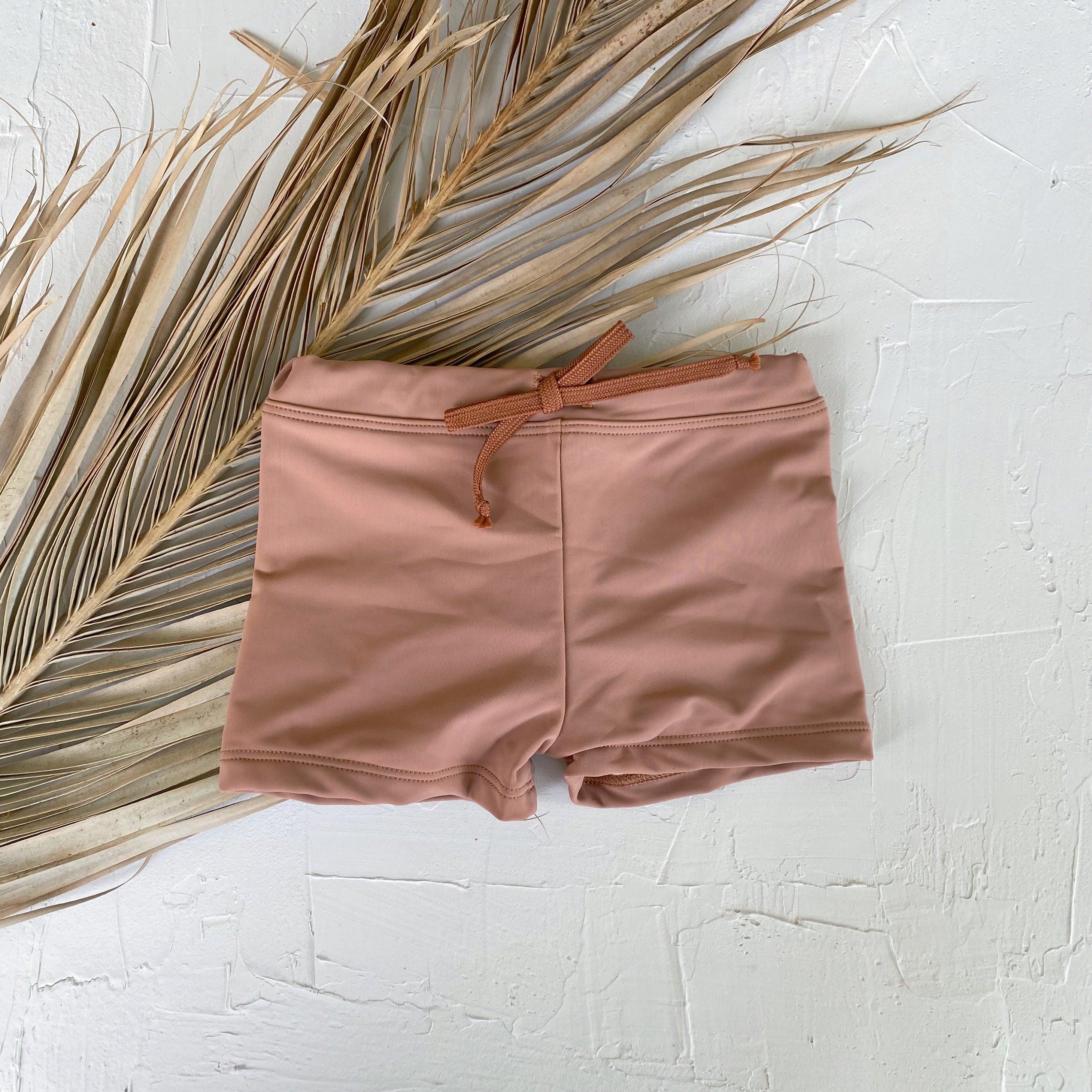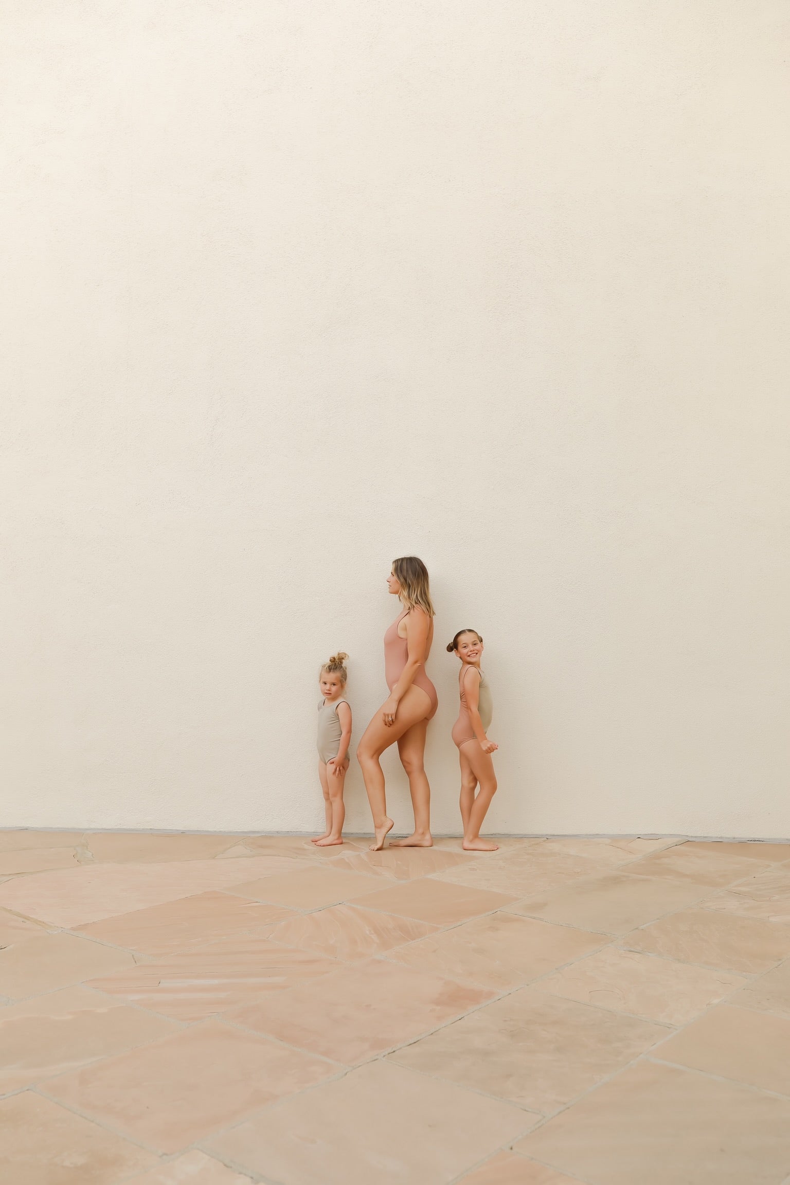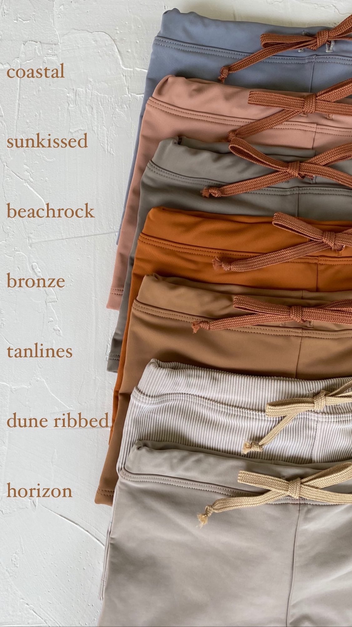 Sunkissed is a beautiful neutral pink that is available in euro shorts, rash guards, on the back of a colorblock girls scoop back one piece (with horizon on the front) and in a ribbed version for the mama snap one piece!