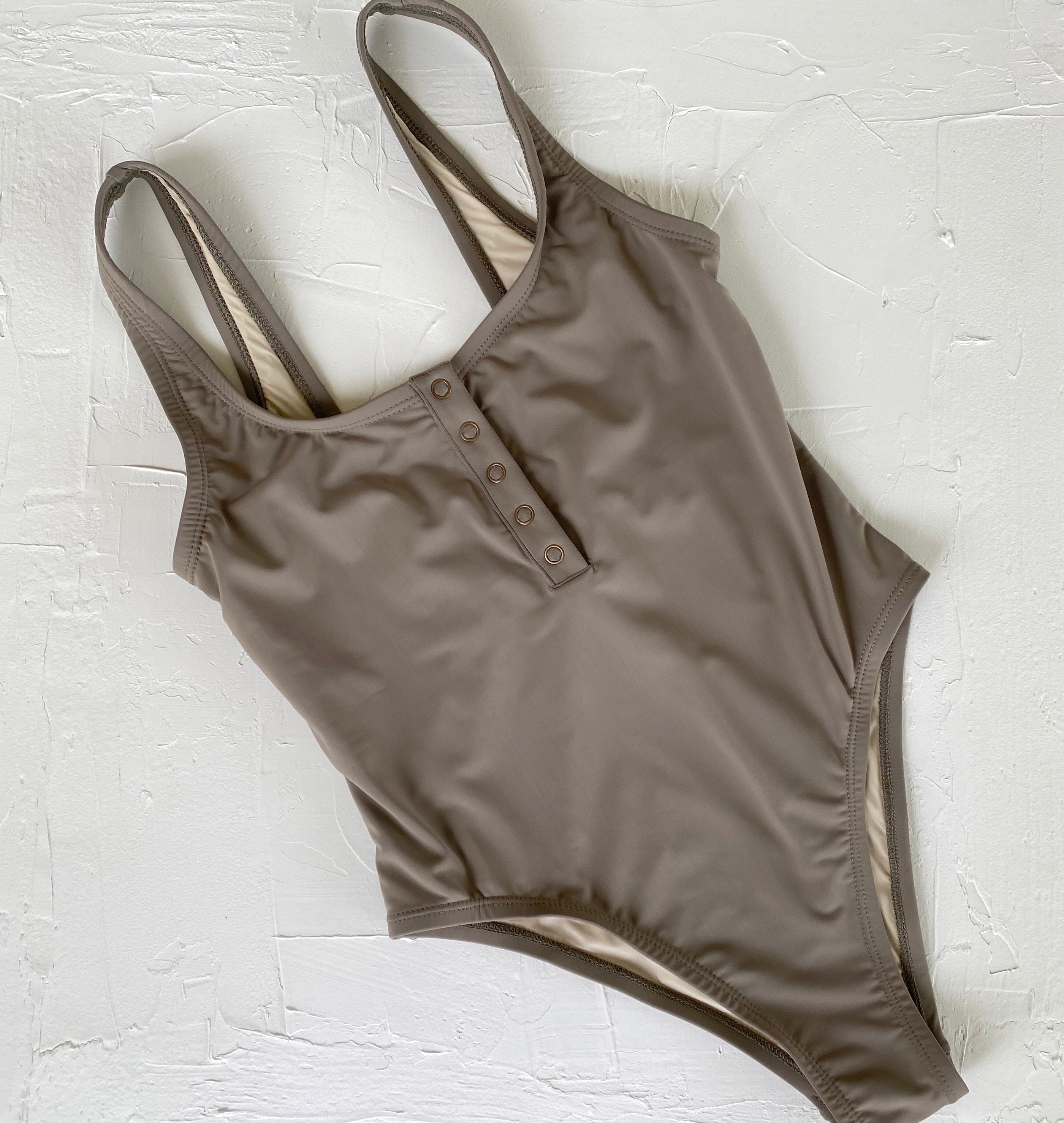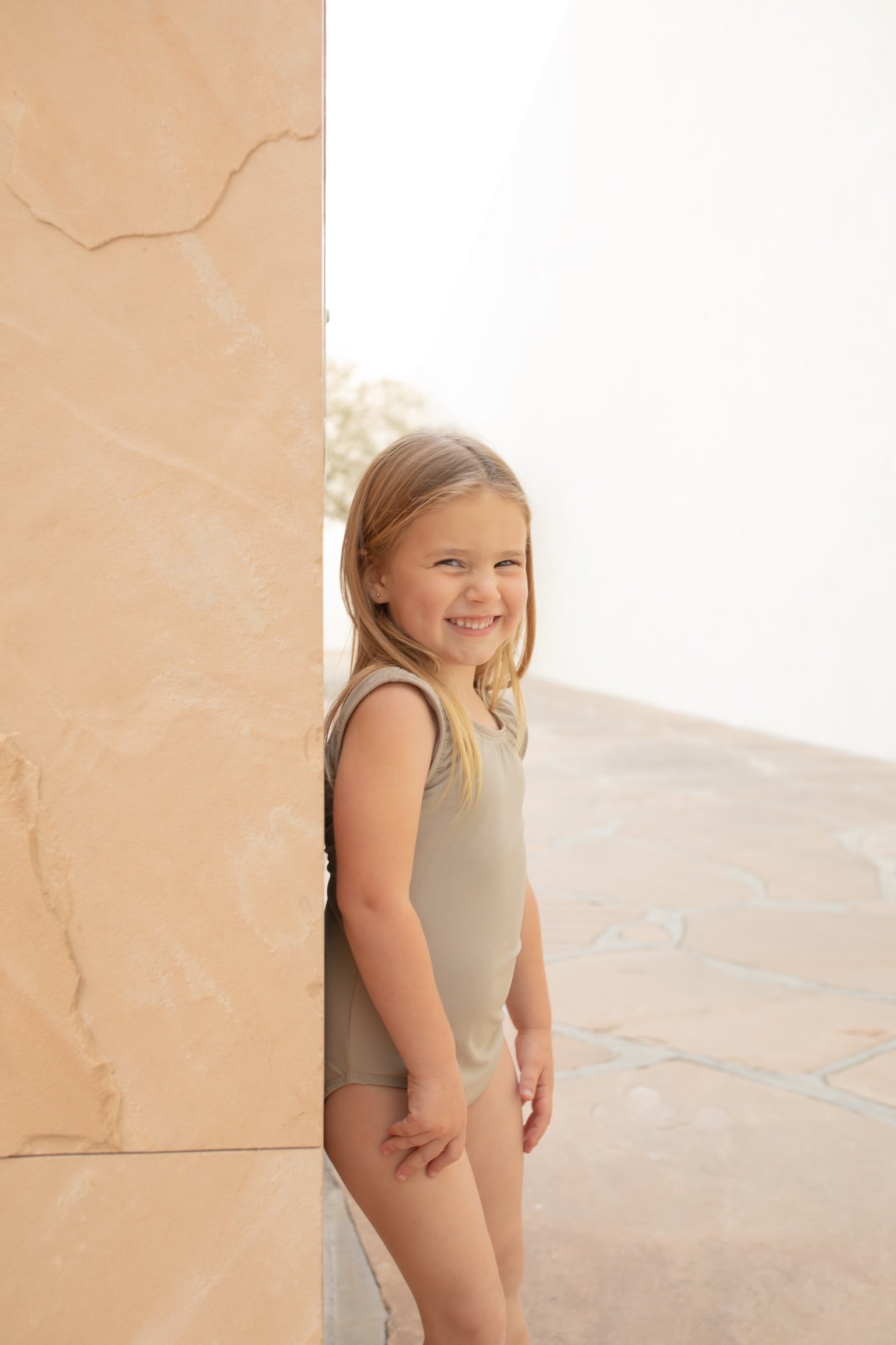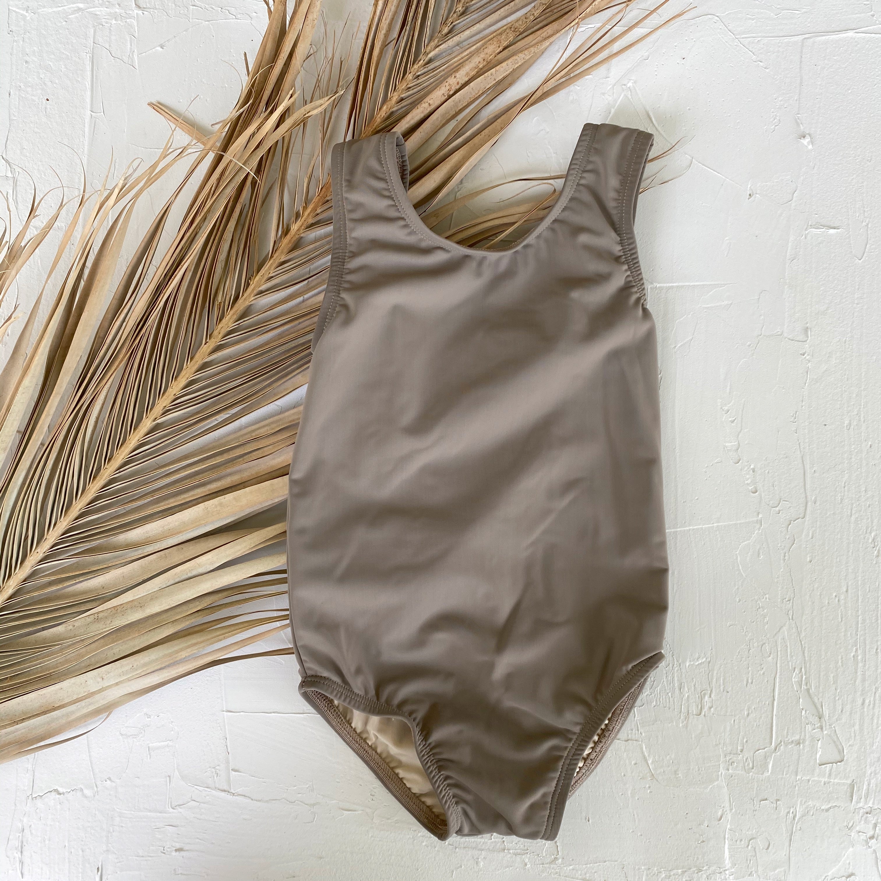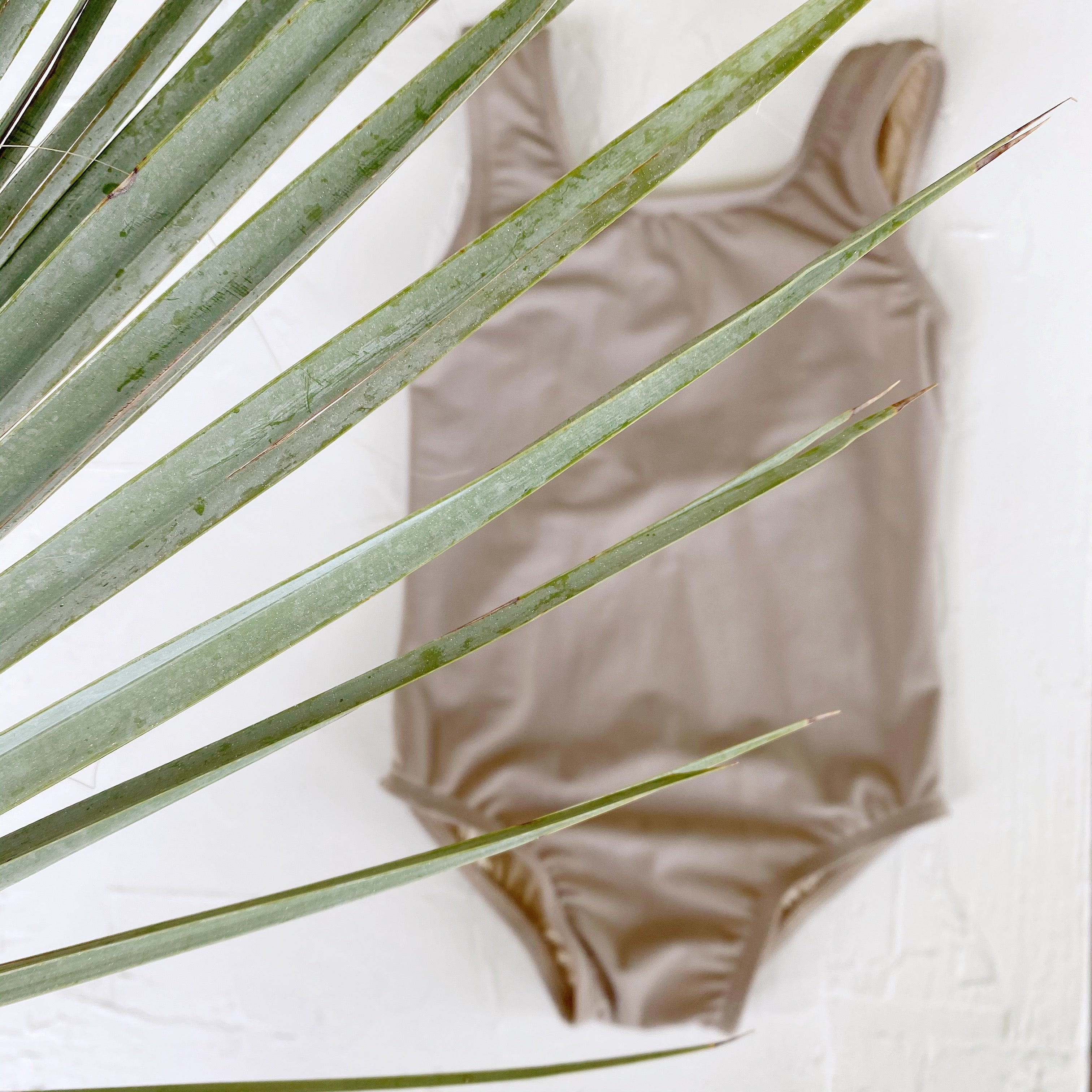 This is another custom dyed color that is a beautiful warm light sage/greige color. It’s sort of a chameleon and looks like more of a warm, subtle sage indoors/in darker light and then outside in bright light, it’s more of a warm griege with the slightest faint green hue to it. It’s beautiful either way and comes in the following styles: girls scoop back one piece, rash guard, and euro shorts.