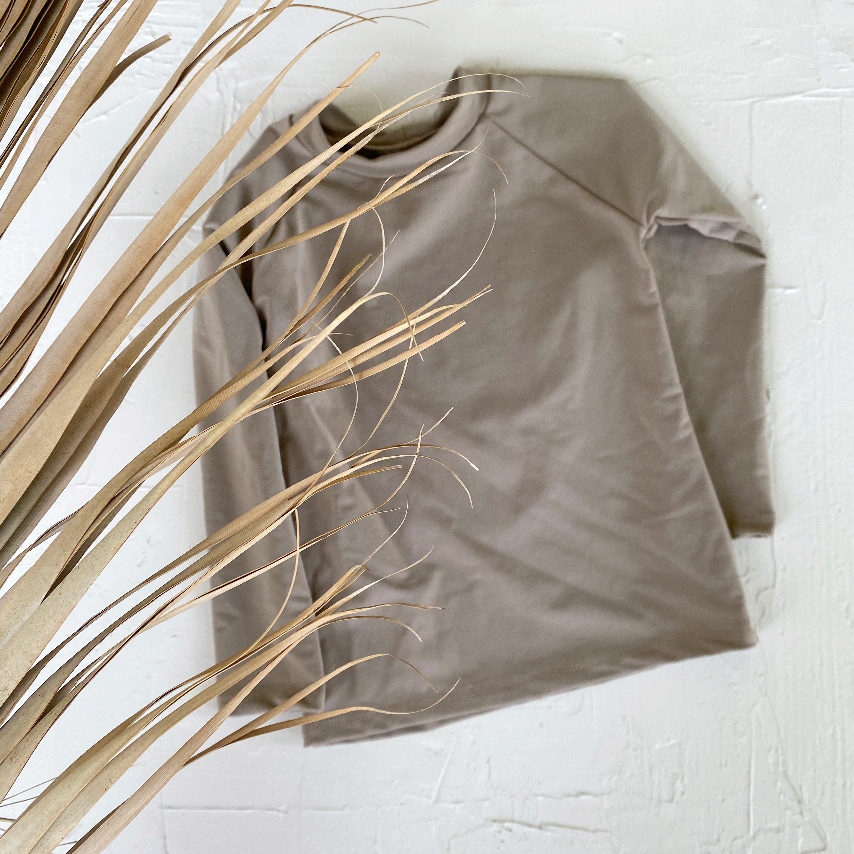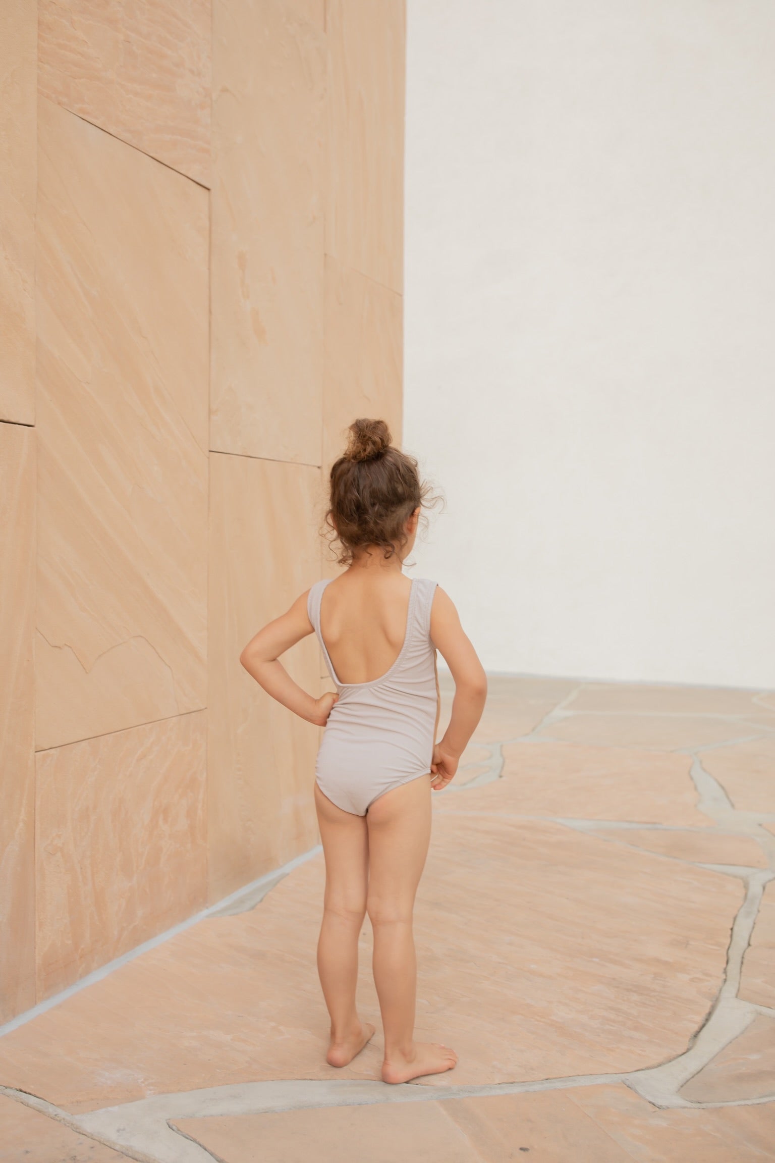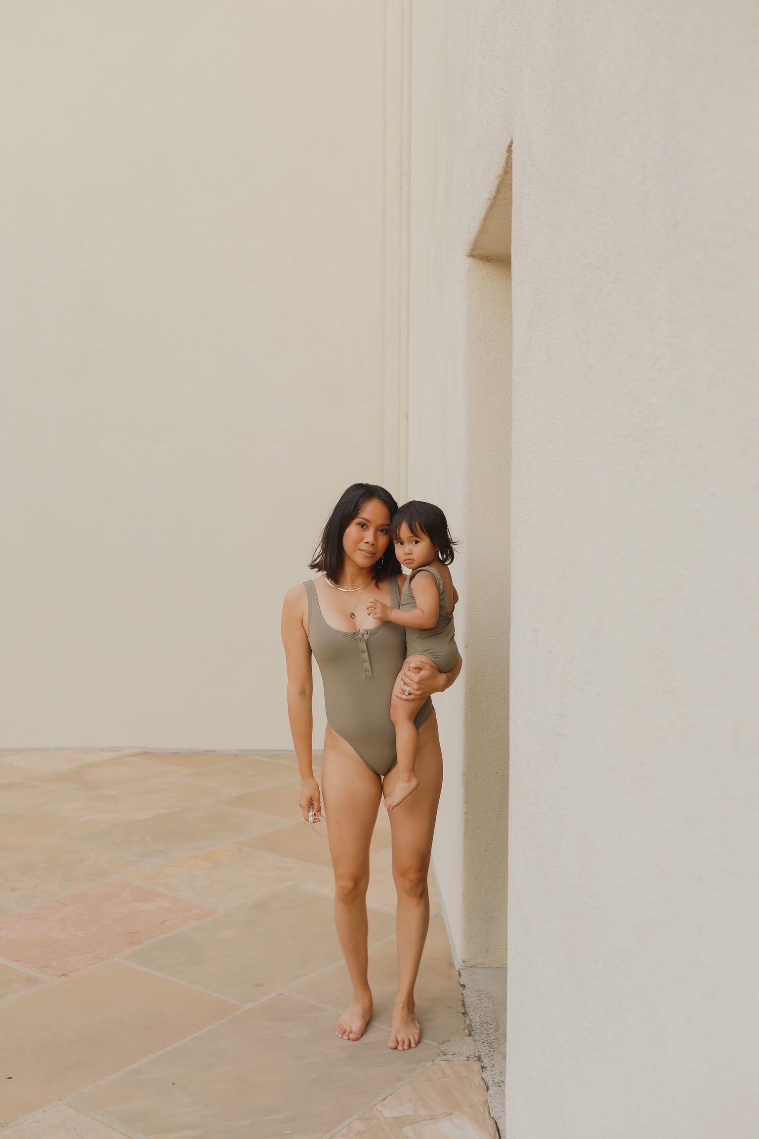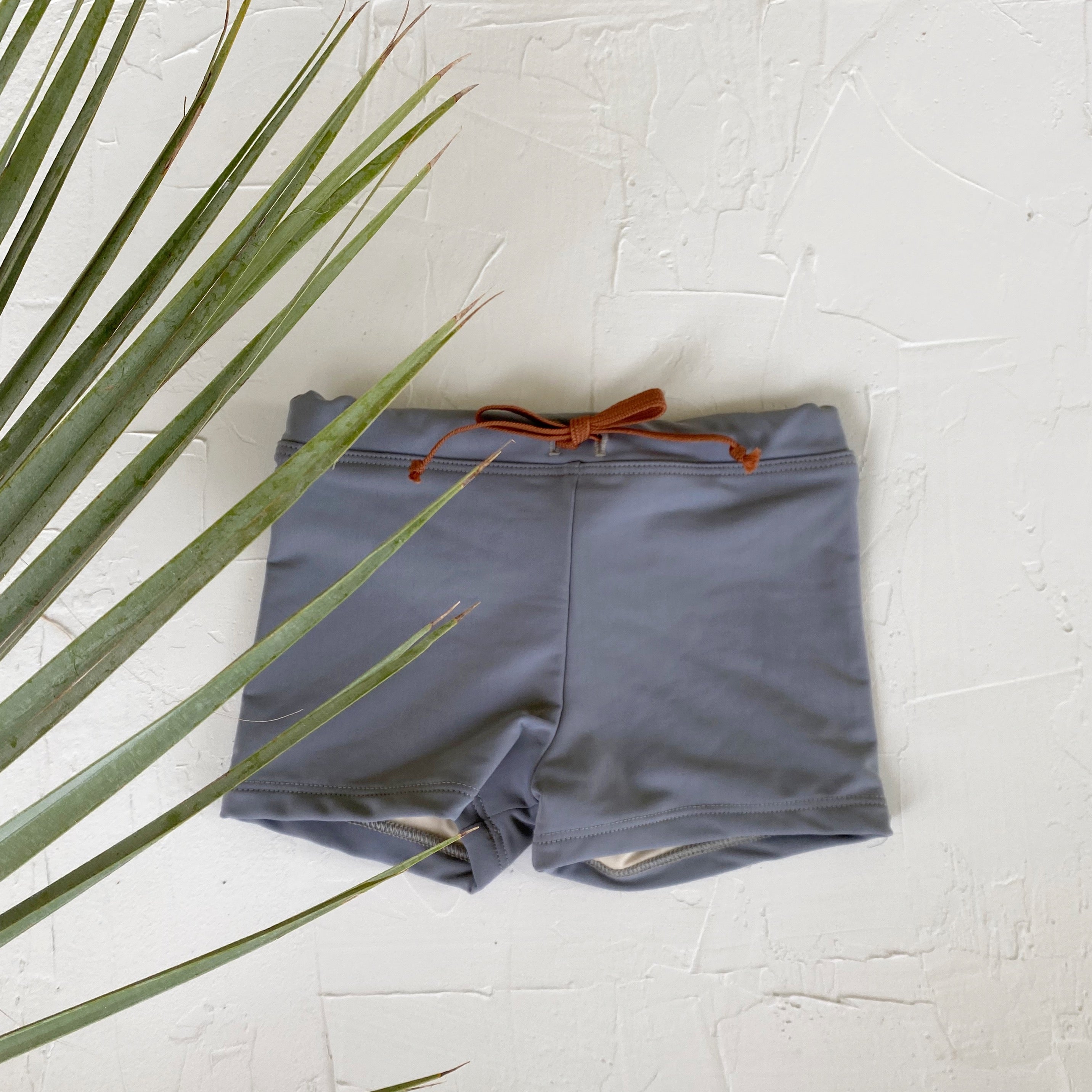 This is another custom dyed color that is a beautiful warm light sage/greige color. It’s sort of a chameleon and looks like more of a warm, subtle sage indoors/in darker light and then outside in bright light, it’s more of a warm griege with the slightest faint green hue to it. It’s beautiful either way and comes in the following styles: girls scoop back one piece, rash guard, and euro shorts.