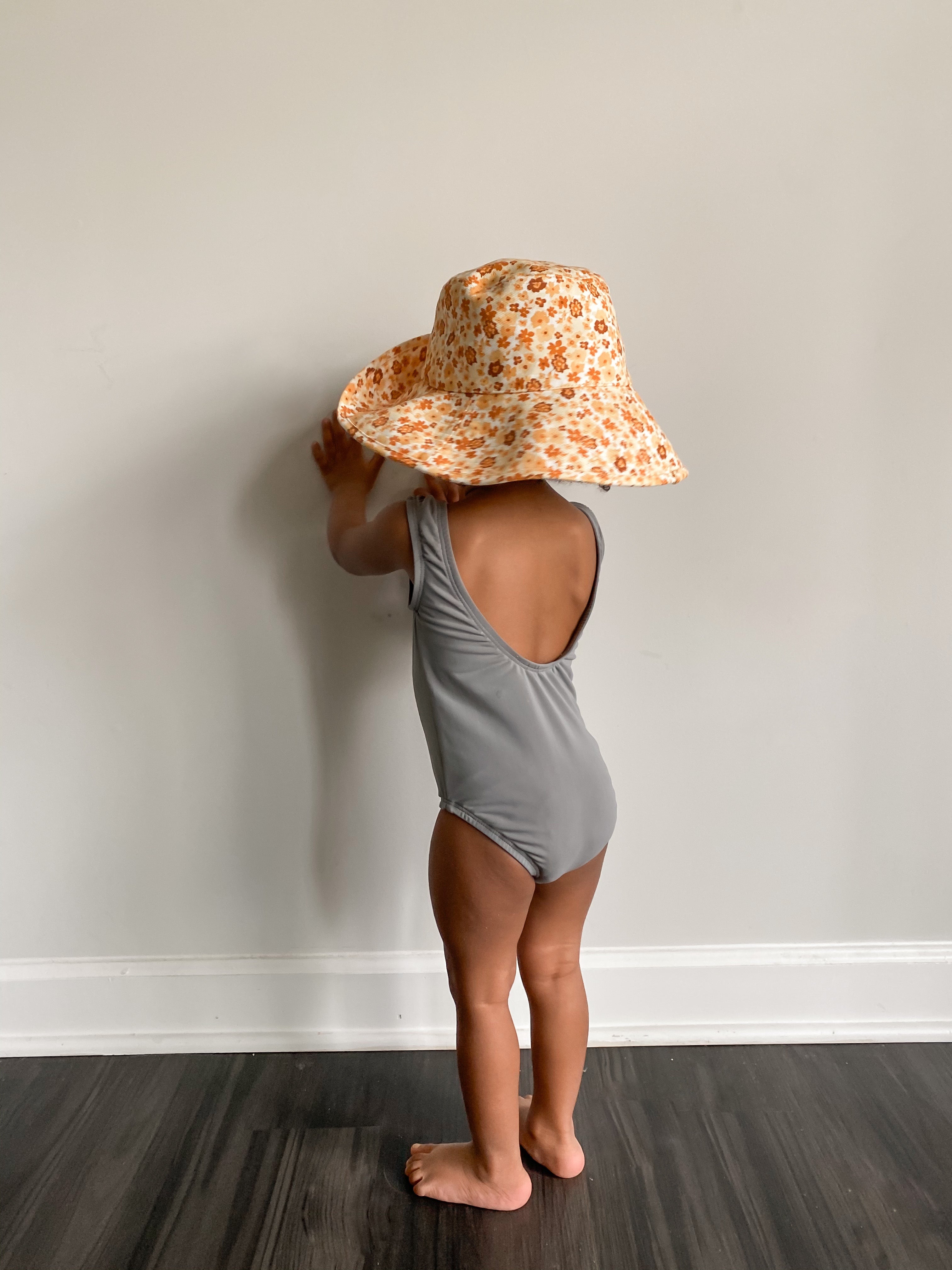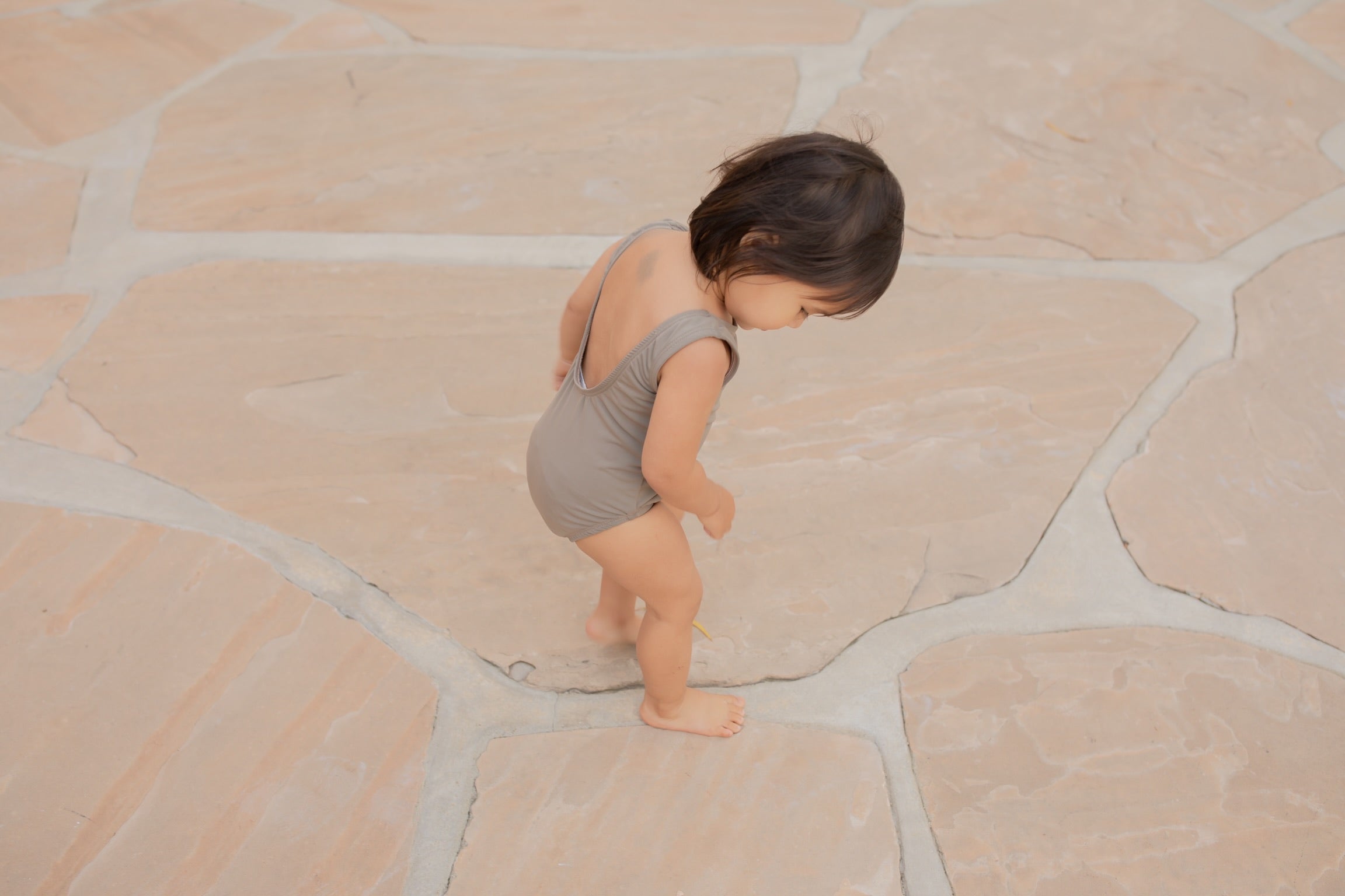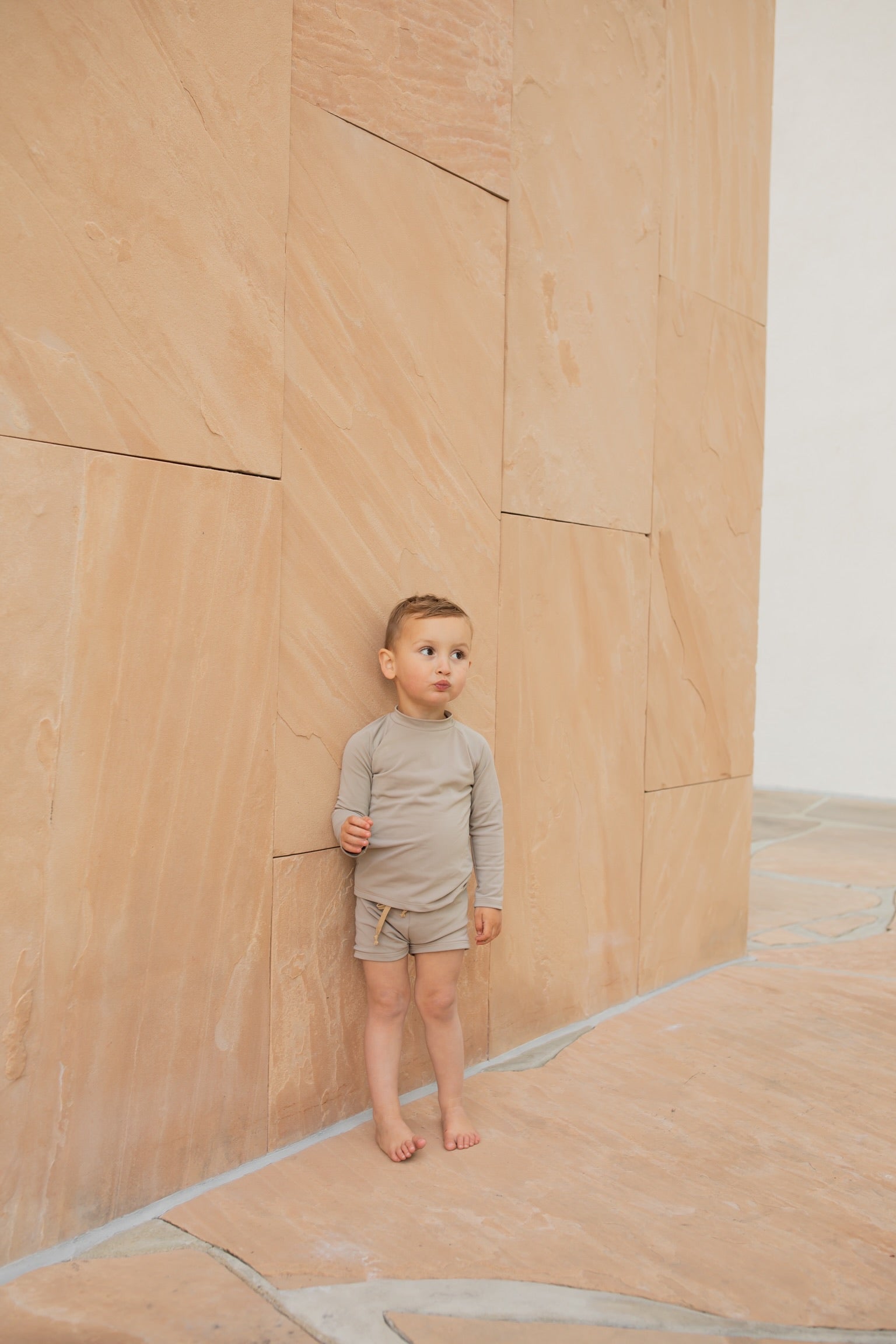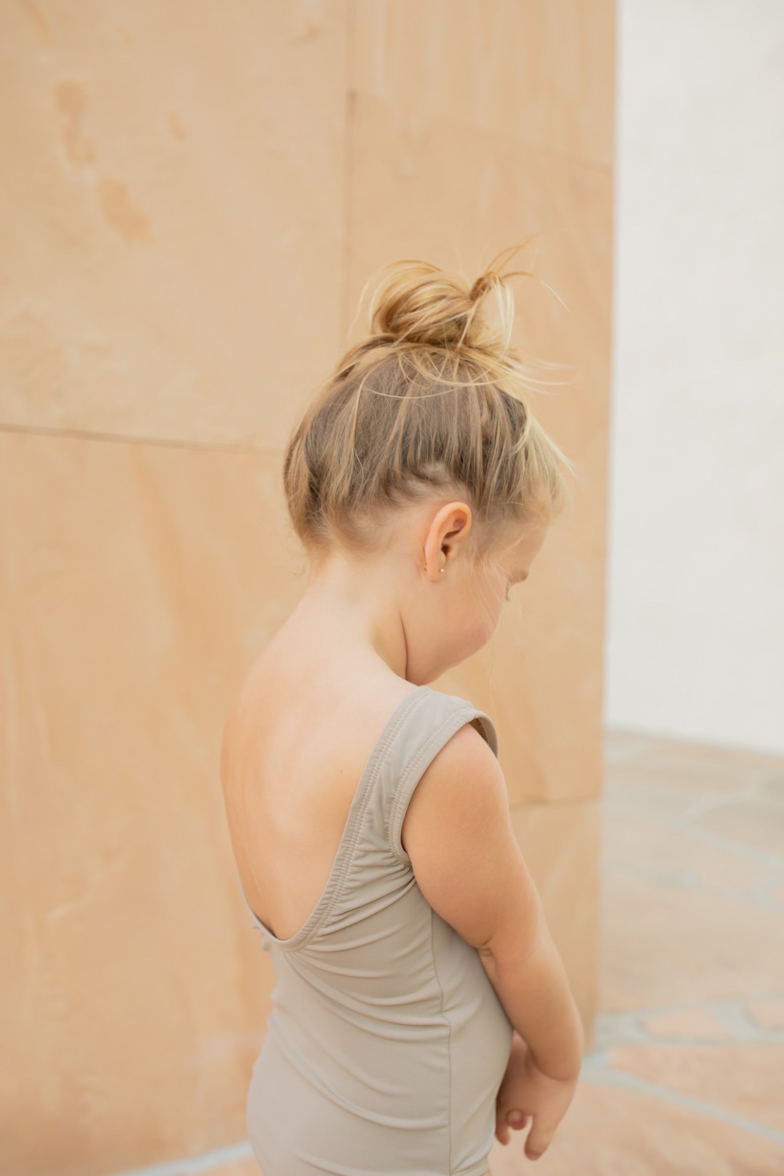 This is another custom dyed color that is a beautiful warm light sage/greige color. It’s sort of a chameleon and looks like more of a warm, subtle sage indoors/in darker light and then outside in bright light, it’s more of a warm griege with the slightest faint green hue to it. It’s beautiful either way and comes in the following styles: girls scoop back one piece, rash guard, and euro shorts.
