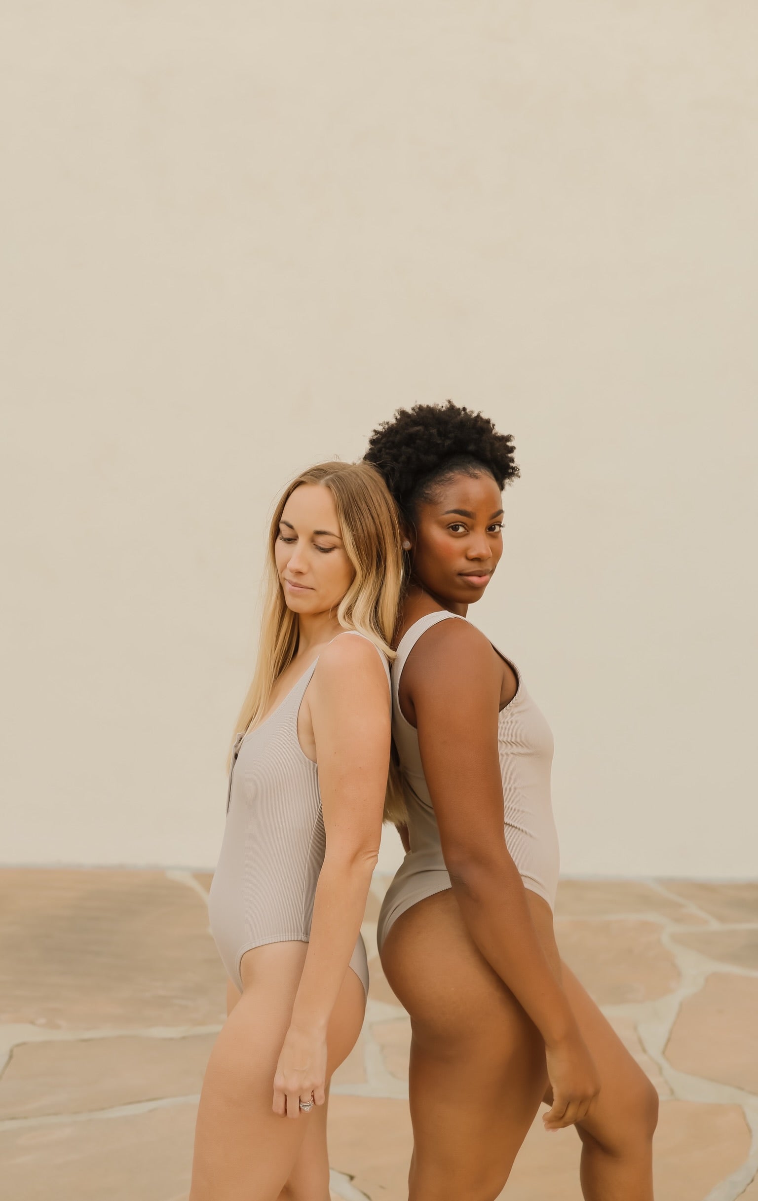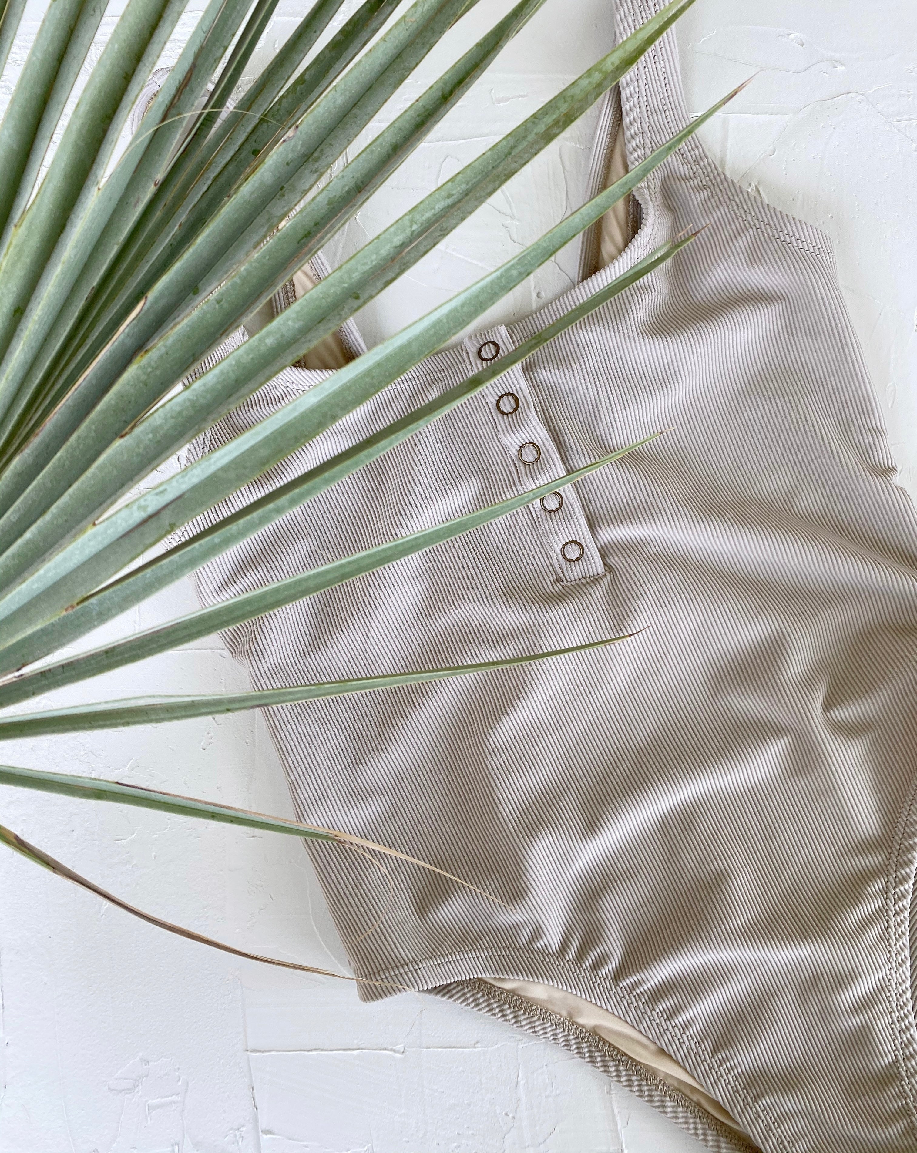 This is a beautiful custom dyed greige color ribbed fabric. This fabric will be available in the following styles: women’s snap one piece, girls scoop back one piece, rash guard, and euro shorts.