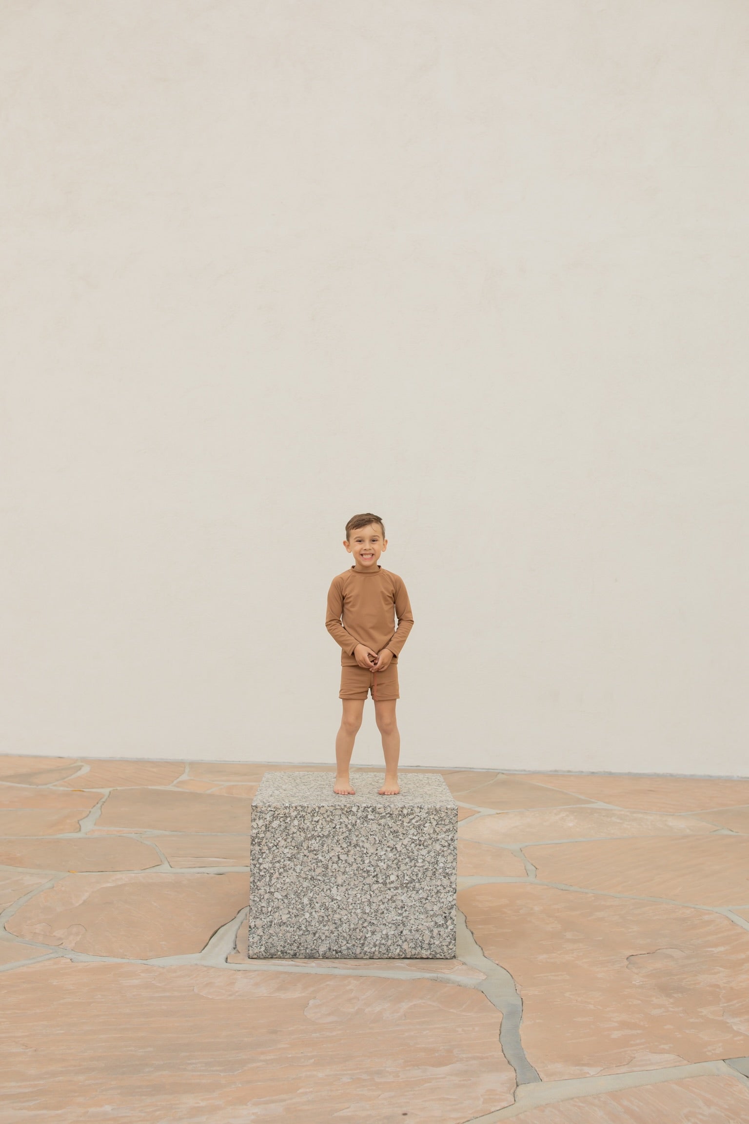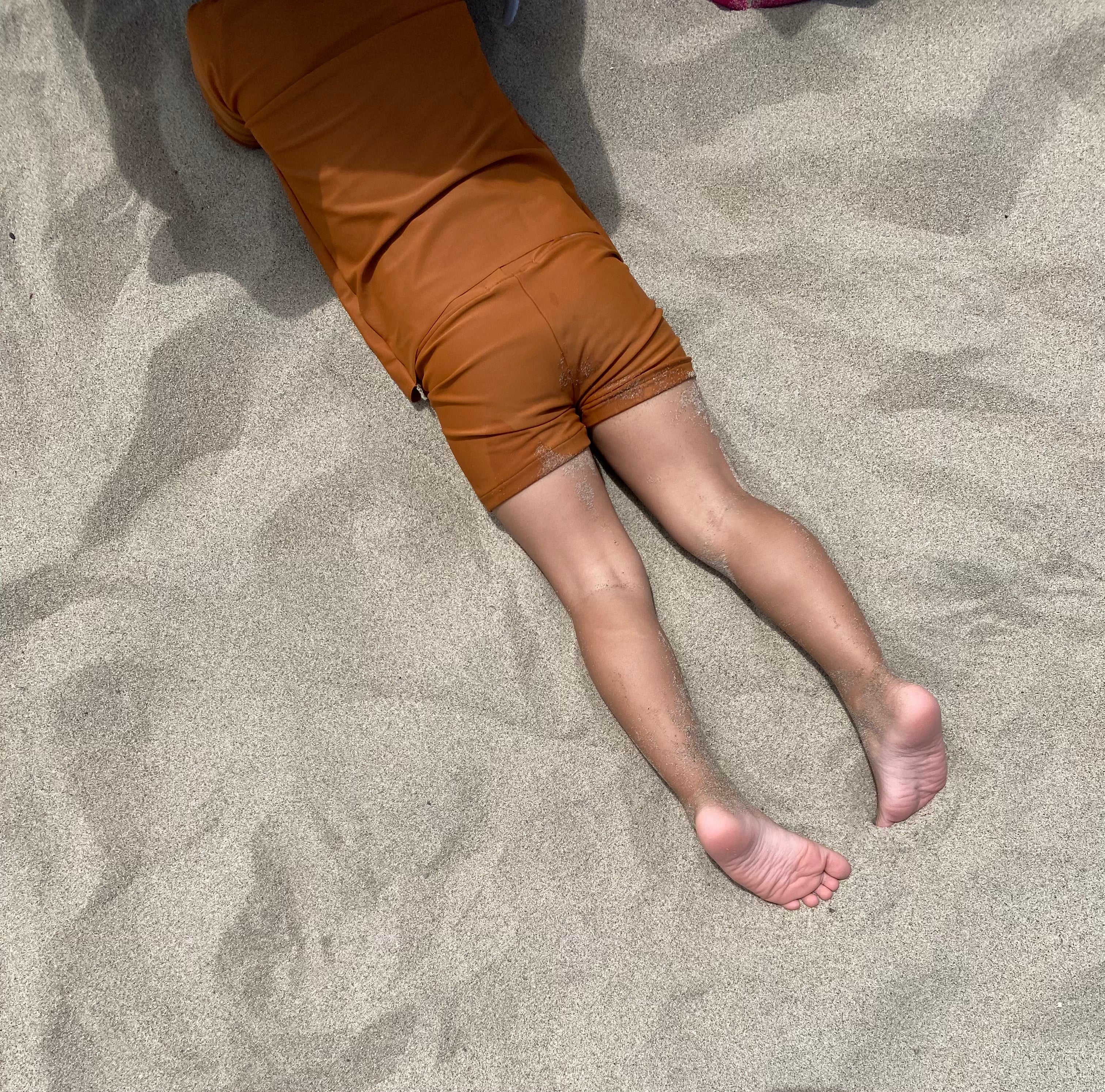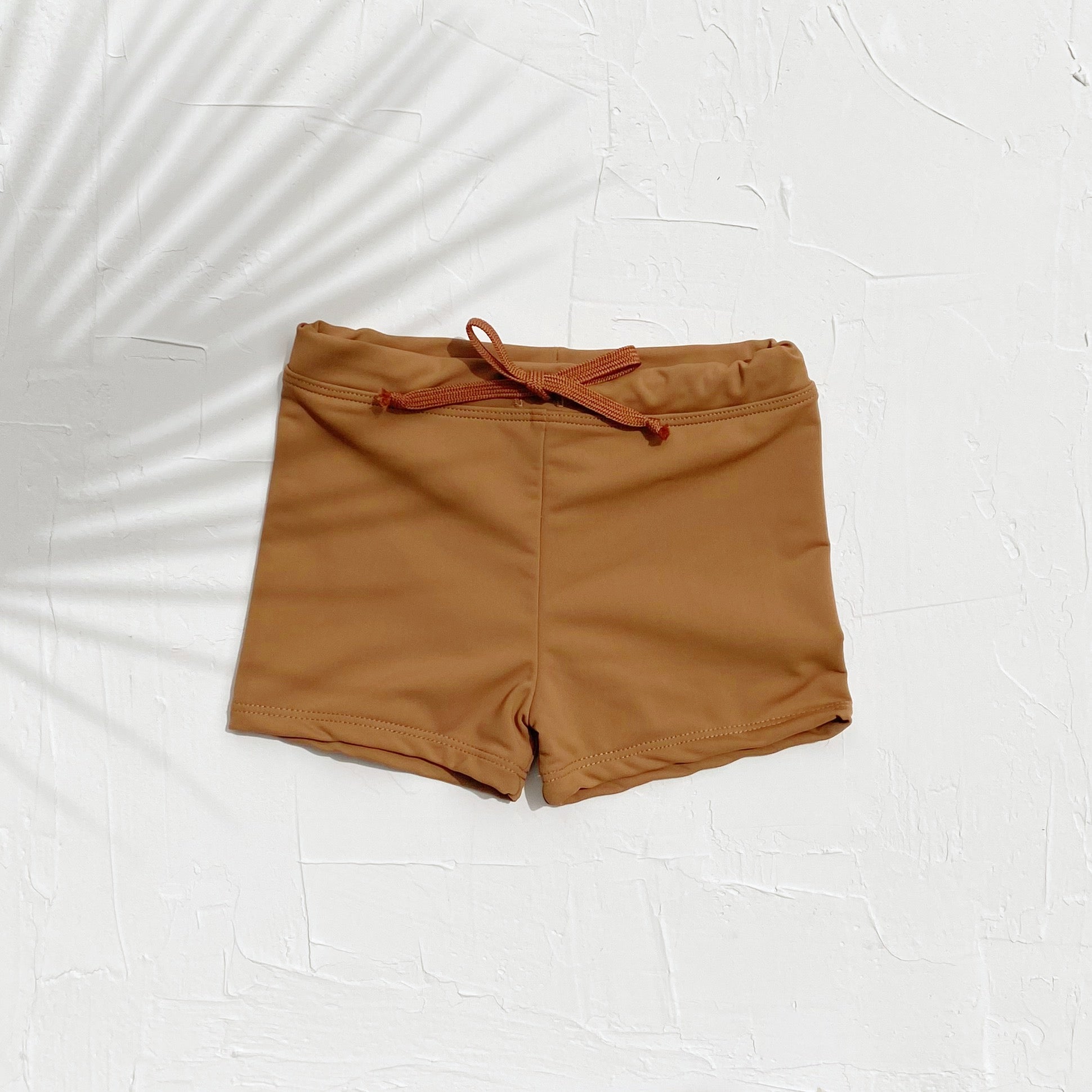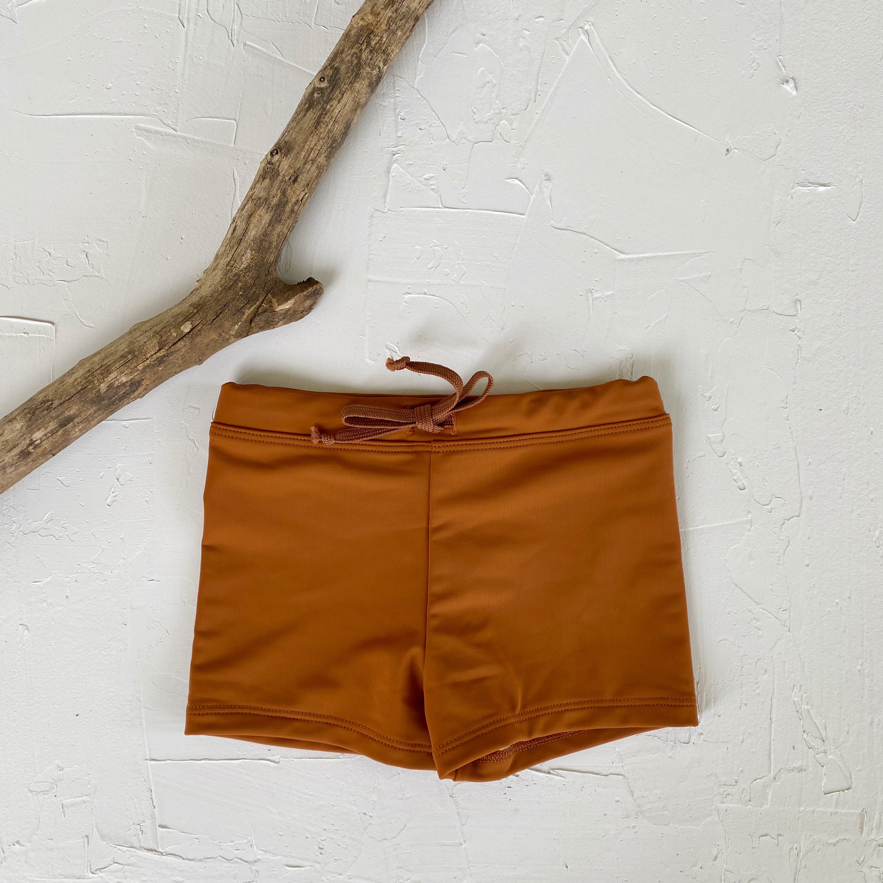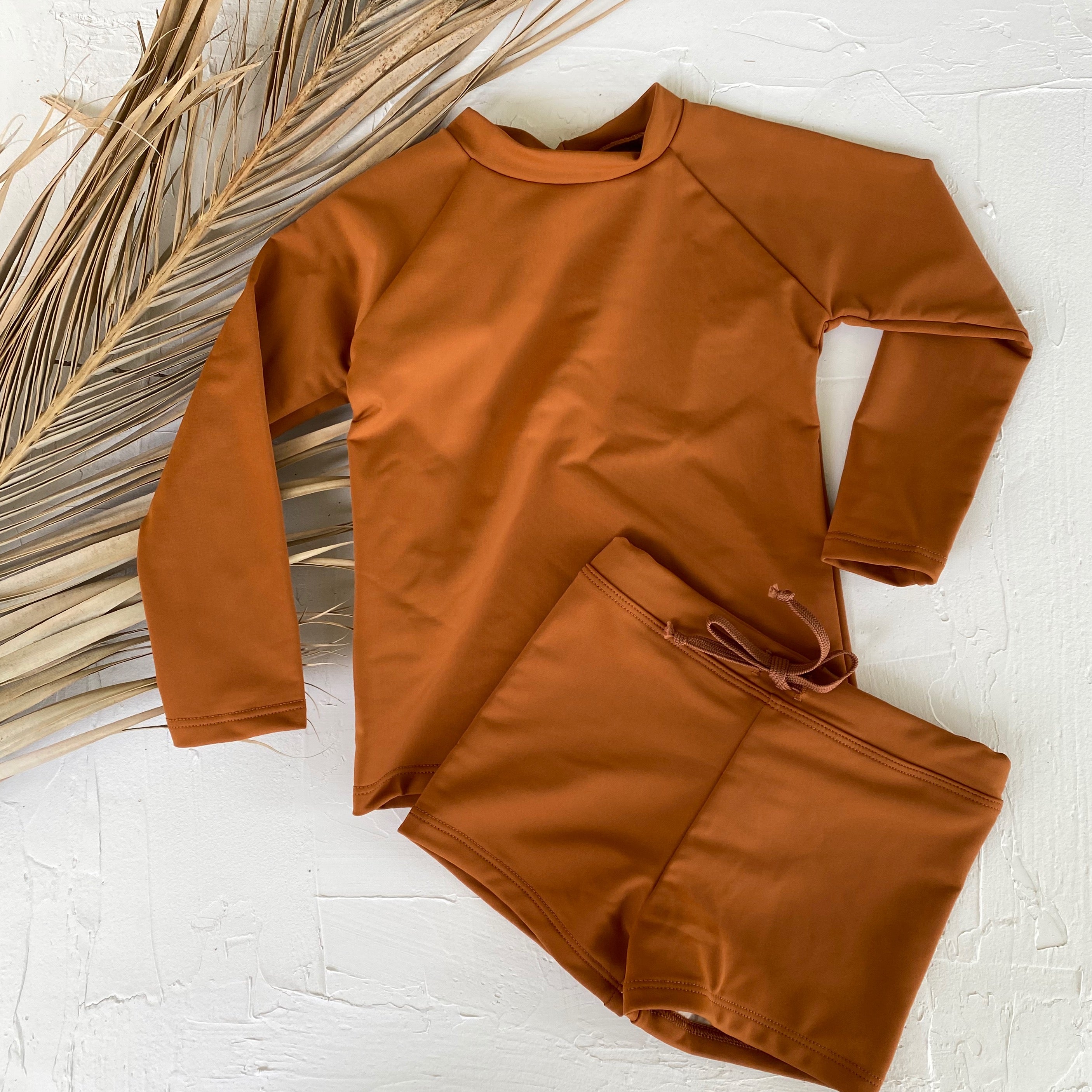 Bronze is the most beautiful rust/red/burnt orange color - it shines differently depending on the light, but it is such a great crossover between a neutral color and a fun pop of color. This style comes in euro shorts and rash guards.
